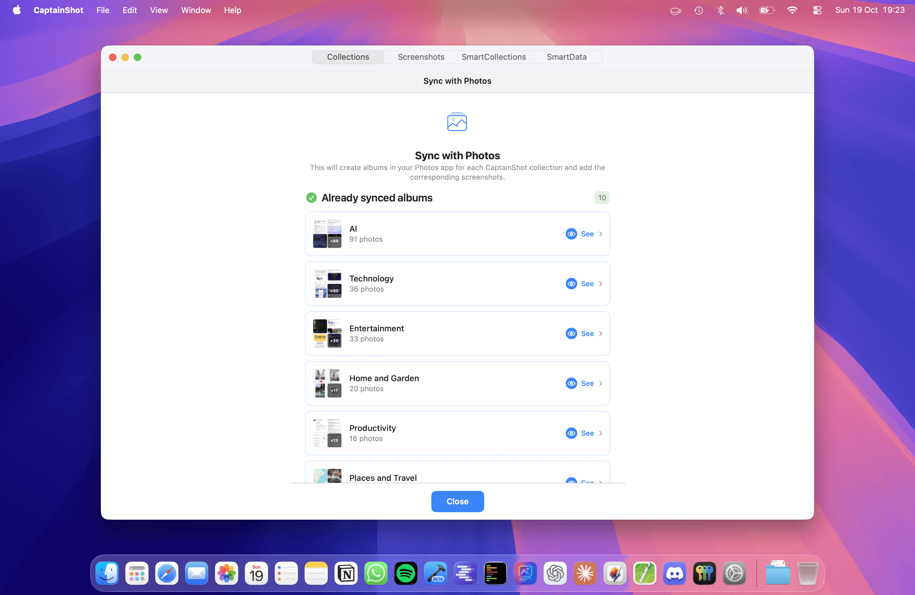 CaptainShot creates and updates dedicated albums in your Photos app. The Photo albums linked to your collections are deleted if you remove them from the app. Your modified titles, moved captures…