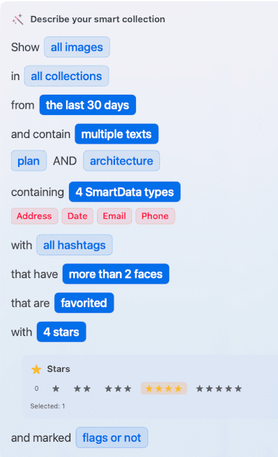 Create custom rules with over 10 types available: text content, keywords, SmartData, faces, periods, favorites, stars, and flags. Combine multiple rules with different logics for ultra-precise collections.