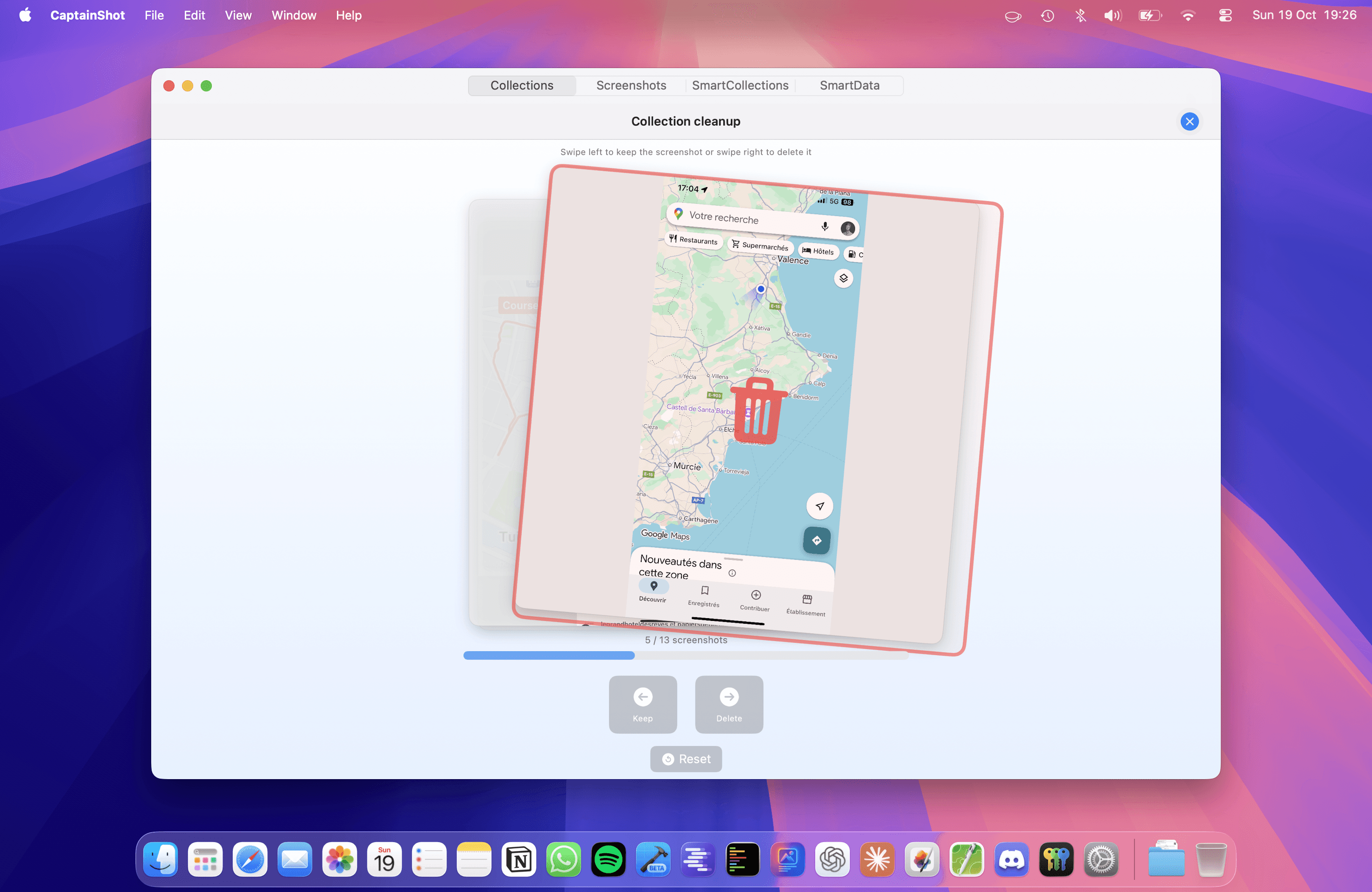 Swipe a screenshot to the right to mark it for deletion, to the left to keep it.